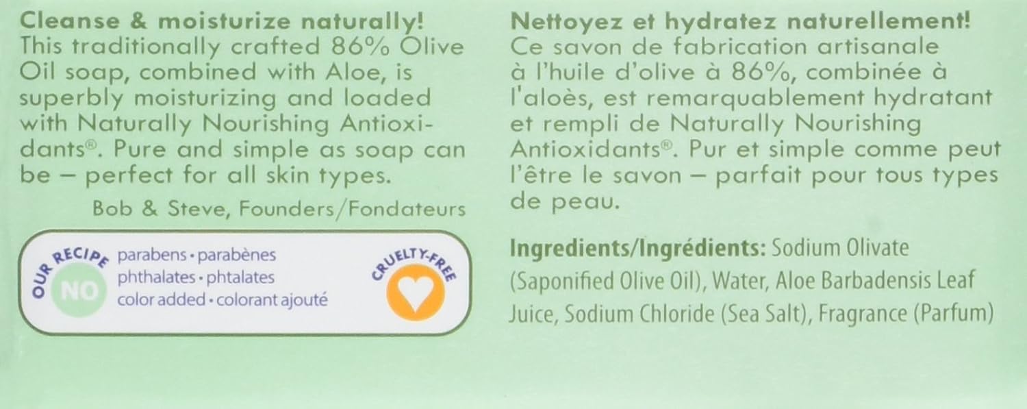 Kiss My Face Olive and Aloe Bar Soap, 8 Ounce -- 6 per case. A Natural Moisturizing Bar Soap. The richness of Olive Oil has been used for centuries to nourish and moisturize the skin, while Aloe Vera has long been acclaimed the "healing plant." We combined Olive Oil and Aloe Vera to create a unique cleansing and so Olive Oil is renowned for its extraordinary emollience Vitamin E to tighten and tone skin Softens skin Rich in Vitamin E & Beta Carotene Ingredients Saponified Olive Oil, Water, Aloe Barbadensis Gel (Aloe Vera), Sodium Chloride, Fragrance. Shelf Life: 999 days